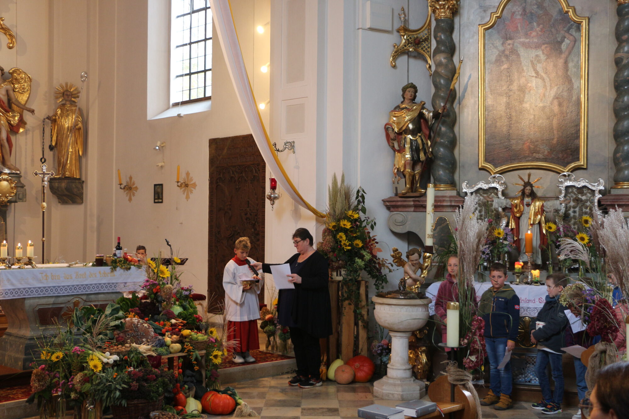 Passend zum Erntedankfest hatte die Vorstandschaft des Obst- und Gartenbauvereins unter Federführung von Maria Gruber und Rosmarie Bauer die Pfarrkirche und den Altar mit Allerlei aus der Natur und dem Garten festlich dekorativ geschmückt und Früchte und Gemüse, Brot und Feld- und Waldfrüchte zusammengetragen. Ihnen, wie auch dem Team des Familiengottesdienstes und vor allem den Kindern dankte Pfarrer Eder für die Vorbereitung und Mitwirkung im Verlauf des Gottesdienstes. Abschließend bot die Katholische Landjugend von der Bäckerei Dirnberger gespendete und im Gottesdienst gesegnete Minibrote zum Verkauf an.