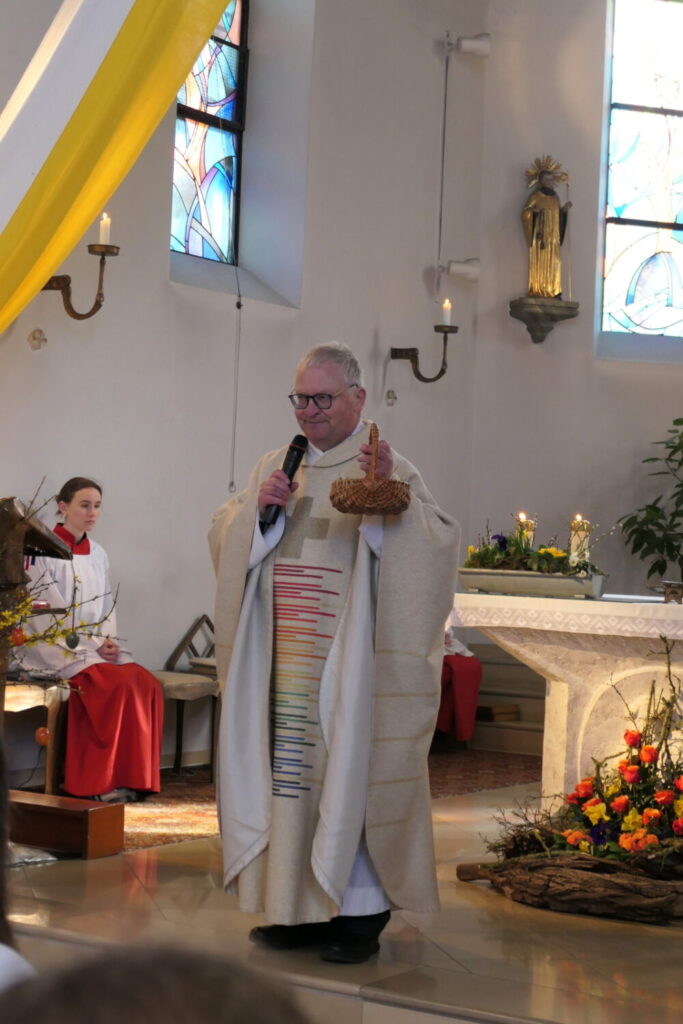 Im Anschluss an den Gottesdienst fand die Weihe der Speisen und des Weihwassers statt. Zum Abschluss spendeten die Gottesdienstbesucher kräftigen Applaus – für den Döferinger Kirchenchor sowie für Johanna Kumschier, die nicht nur mit den Kindern das Osterstück einstudiert hatte, sondern das ganze Jahr über die Kirche mit liebevollem Blumenschmuck verschönert.