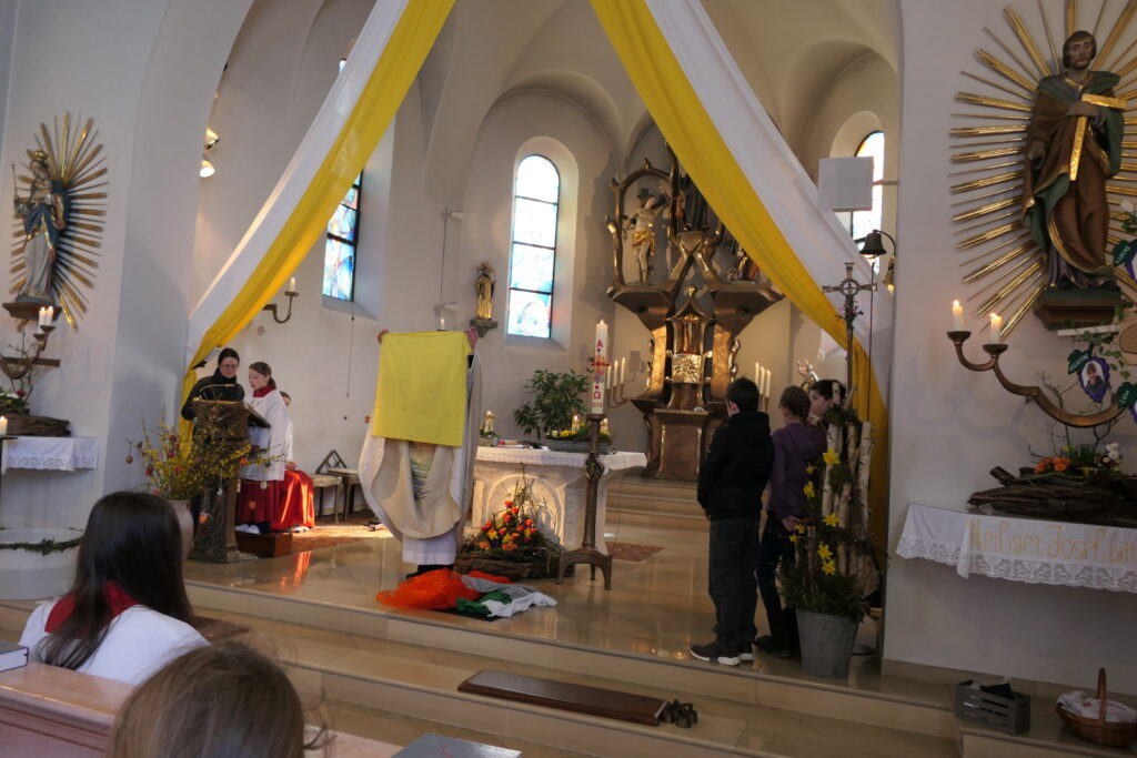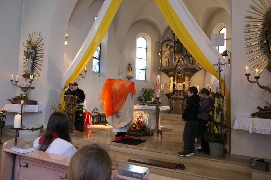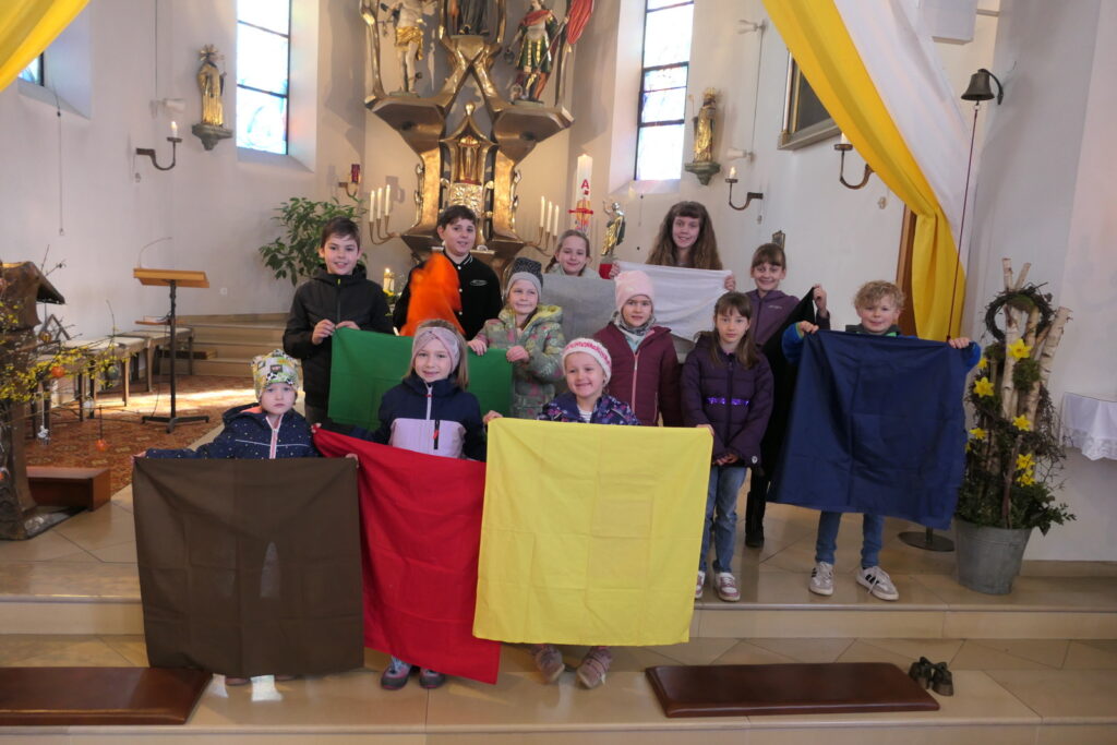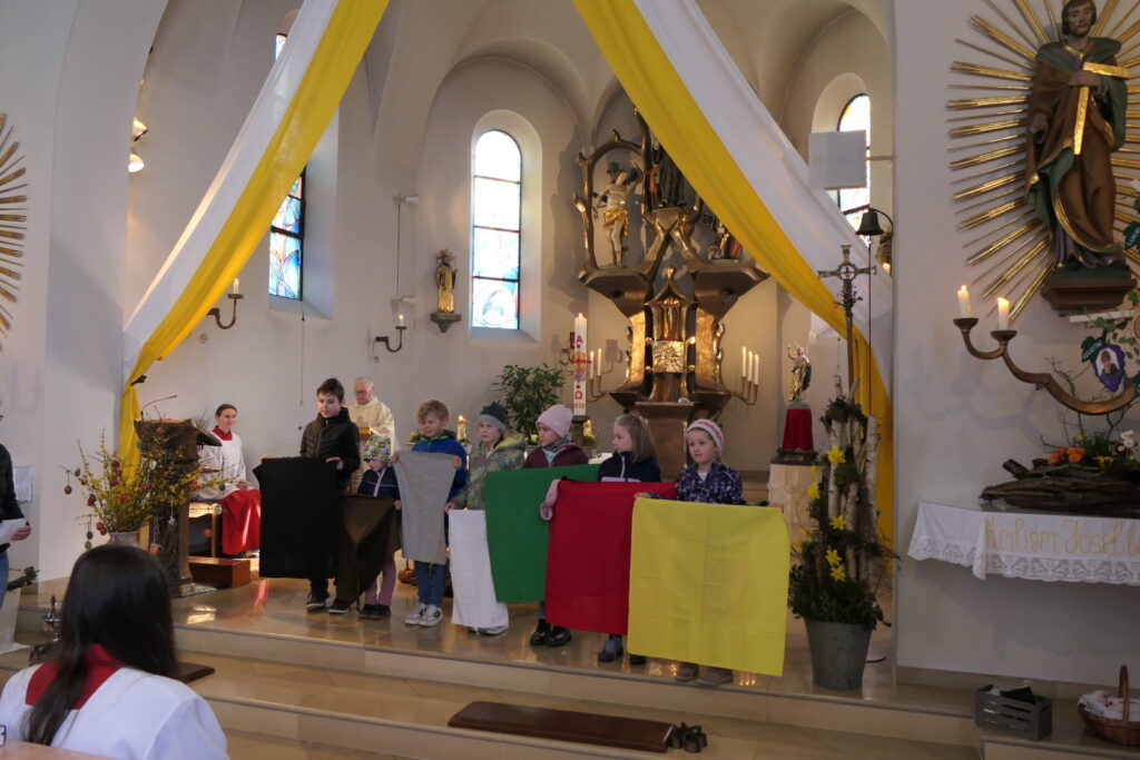 Ein besonderer Höhepunkt des Gottesdienstes war eine kleine Aufführung der Kinder, die von Johanna Kumschier vom Pfarrgemeinderat einstudiert worden war. Mit verschiedenfarbigen Tüchern erzählten die Kinder anschaulich die Ostergeschichte: Ein schwarzes Tuch stand für die Nacht und Dunkelheit, ein rotes für Feuer und Leid, ein oranges für den Weg der Frauen zum Grab Jesu. Mit Grün wurde das Leben symbolisiert, Grau stand für den schweren Grabstein und Weiß für die bange Überlegung, wie dieser bewegt werden könne. Gelb machte schließlich die Erkenntnis der Frauen sichtbar, dass Jesus auferstanden ist, während Blau die frohe Botschaft darstellte, die sie weitertrugen.