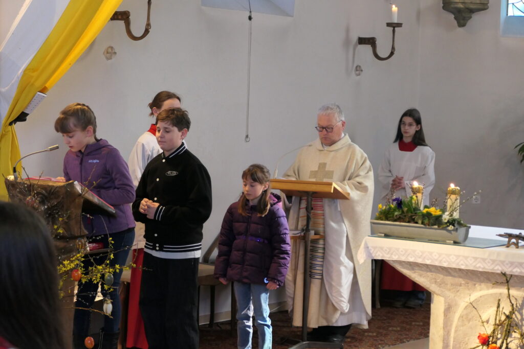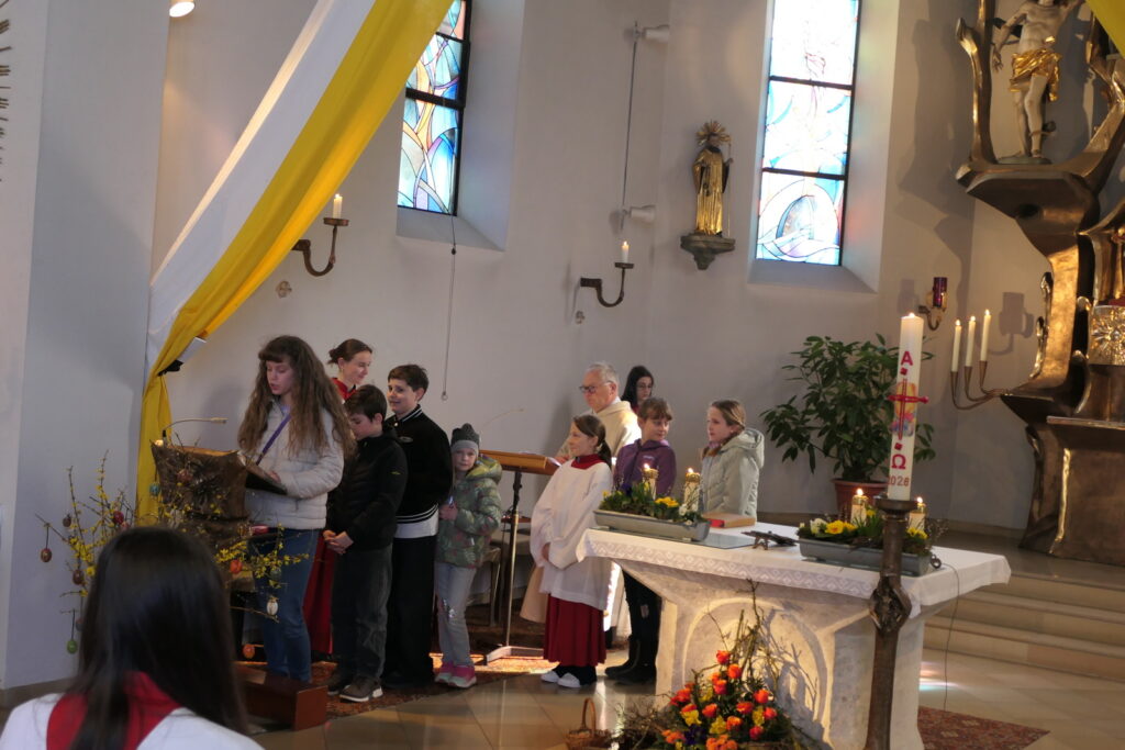 Am Grab begegneten die Frauen zwei Männern in hellen Gewändern – Engel, die ihnen zusprachen: „Fürchtet euch nicht! Warum sucht ihr den Lebenden bei den Toten? Jesus ist nicht hier, er ist auferstanden.“ Diese zentrale Osterbotschaft wurde von den Kindern eindrucksvoll und verständlich vermittelt.