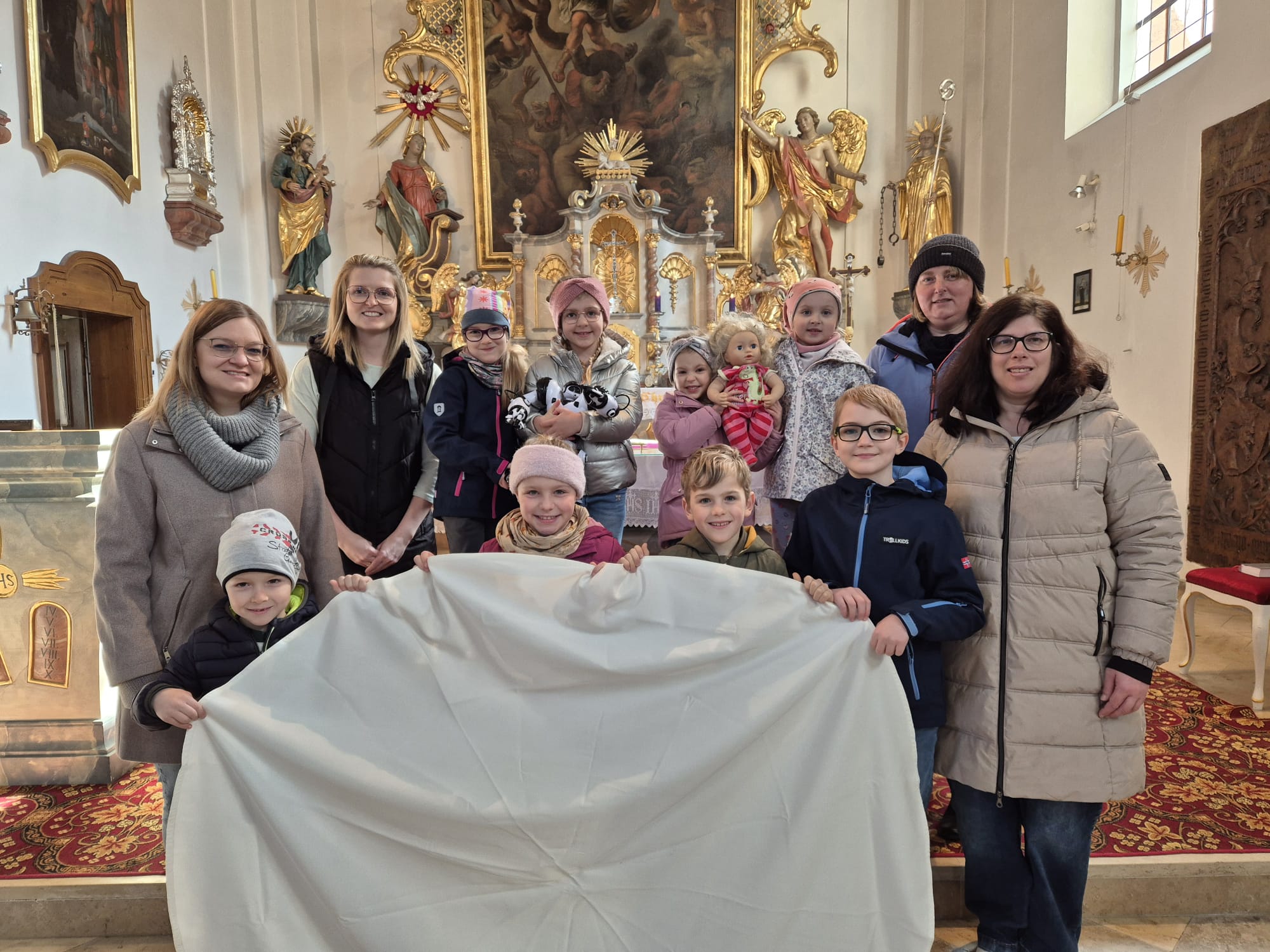Gleich zu Beginn der Gottesdienstfeier stellten sich die mitwirkenden Mädchen und Jungen vor dem Altar auf und liesen mit einem großen Tuch die Luft zumindest in den vorderen Bänken spüren. Luft zu atmen sei der bedeutende Unterschied zu einer mitgebrachten Puppe oder einem Roboter. Gott habe den Menschen Leben eingehaucht, sodass sie ein Leben lang mit ihm verbunden sind. Das Hauchen könne man spüren meinte Pfarrer Eder und rief auf, dies mit der Hand vor dem Mund nachzustellen. Wie es die Lesung aus dem Buch des Propheten Ezechiel verkündete, lasse der von Gott eingehauchte Geist den Menschen lebendig werden und mit Gott in Gedanken und im Gebet verbunden sein.