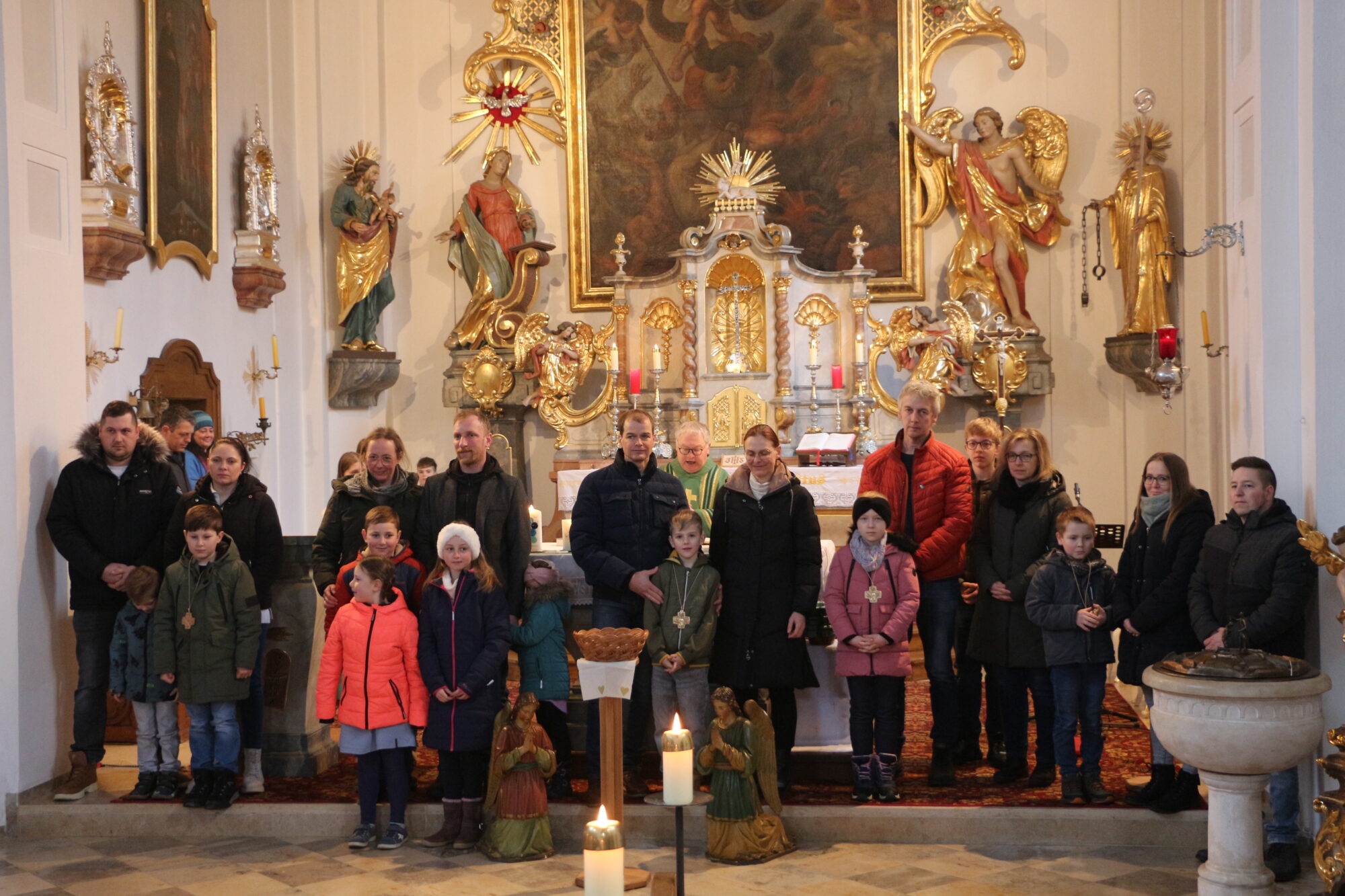 Pfarrer Eder rief die Kommunionkinder an den Altar, wo sie ihren Glauben und ihr Taufbekenntnis erstmals selbst bezeugten und er die Taufkerzen der Kinder entzündete. Als Zeichen für ihren Glauben erhielten die Kommunionkinder von ihren Eltern ein zuvor geweihtes Bronzekreuz umgehängt.