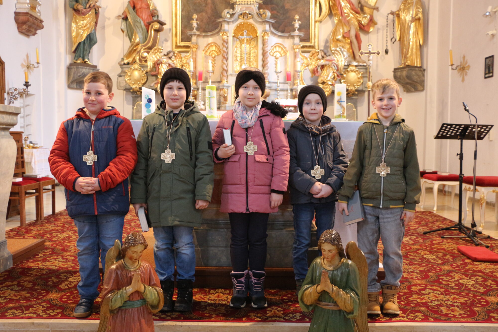 Namentlich empfangen die erste heilige Kommunion Julian Blaschke, Korbinian Horn, Isabelle Schütz, Elias Sopper und Raphael Steffens.