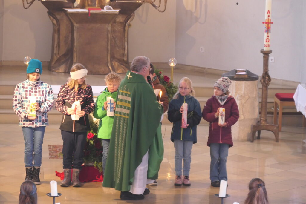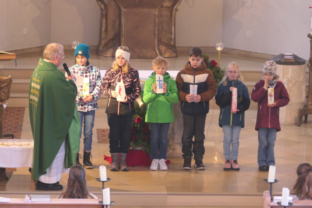 Ein besonderer Moment war die Rückbesinnung auf die Taufe. „Eure Eltern haben euch vor acht Jahren als kleine Babys in die Kirche gebracht“, erinnerte Pfarrer Eder die Kinder. Taufe und Eucharistie seien eng miteinander verbunden – zwei Sakramente, die den Weg des Glaubens eröffnen und stärken. Anschließend traten die Kommunionkinder zum Altar und nahmen ihre Taufkerzen in Empfang. Für Paul Ederer, Lukas Zimmermann, Charlet Fleischmann, Emilia Rötzer, Lena Höcherl und Felizitas Wagner entzündete Pfarrer Eder die Kerzen, nachdem diese vor der Gemeinde ihr Taufversprechen erneuert hatten.
